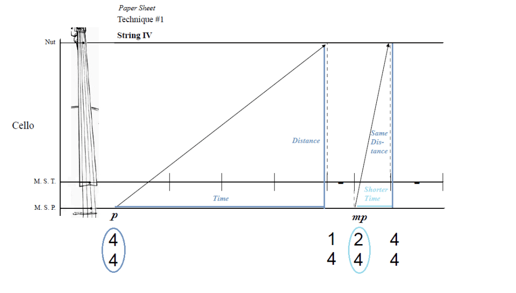 Score excerpt from suelo seco, showing the relation time-distance for the instrumental techniques.